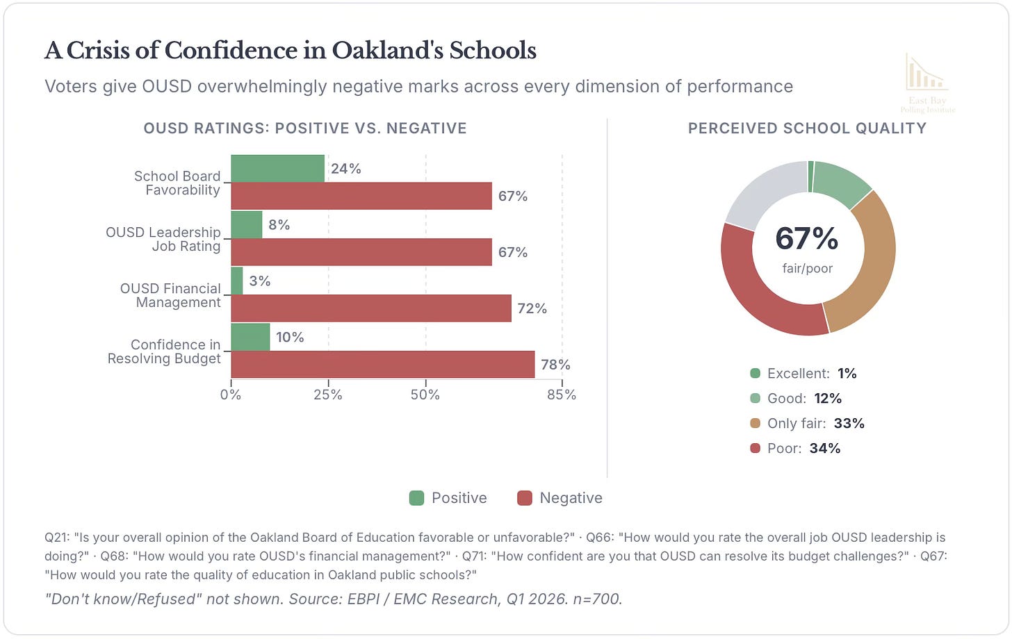 Today, a new poll dropped from the East Bay Polling Institute, which surveyed 700 registered voters across Oakland – roughly 100 voters in each of Oakland’s seven city council districts.