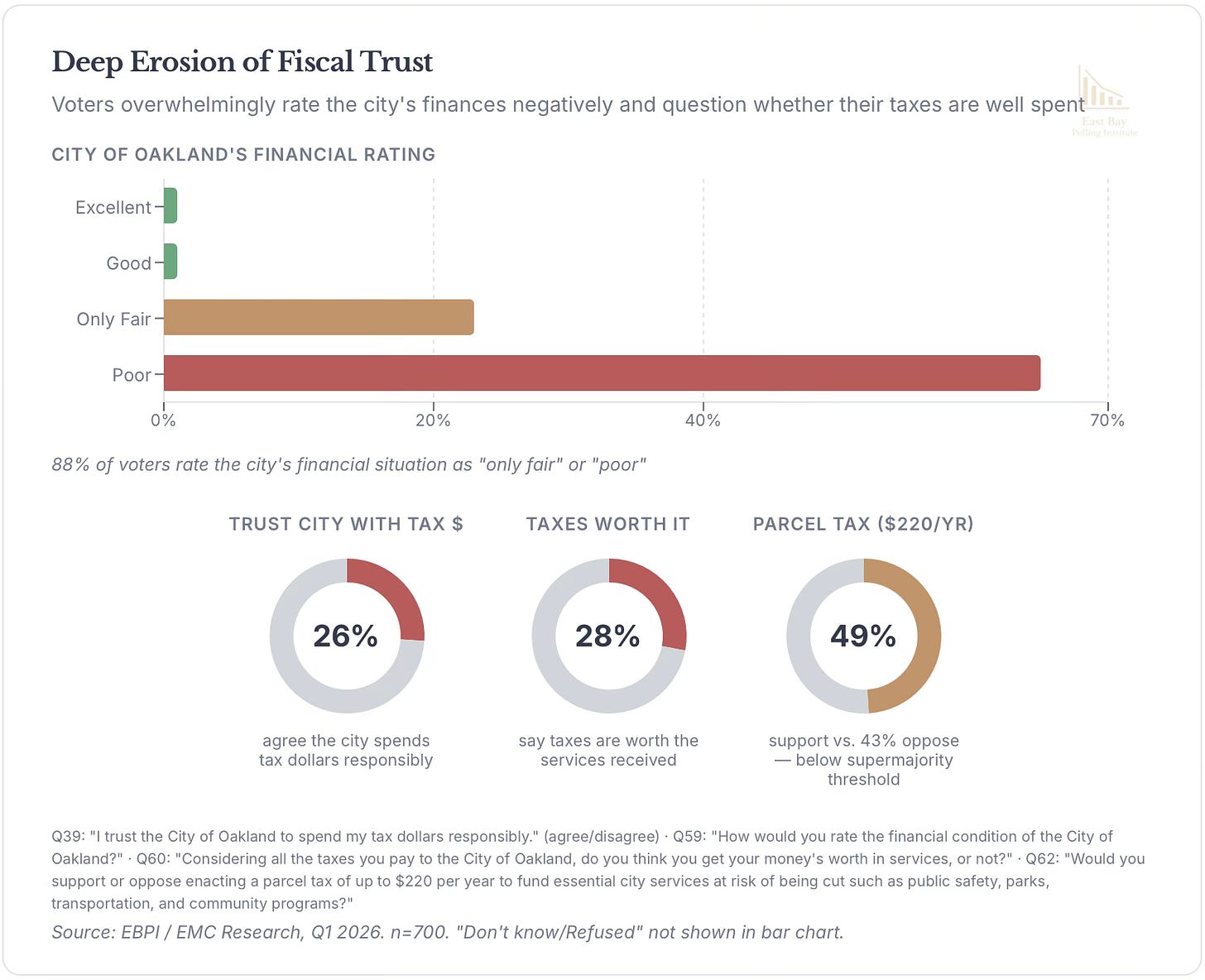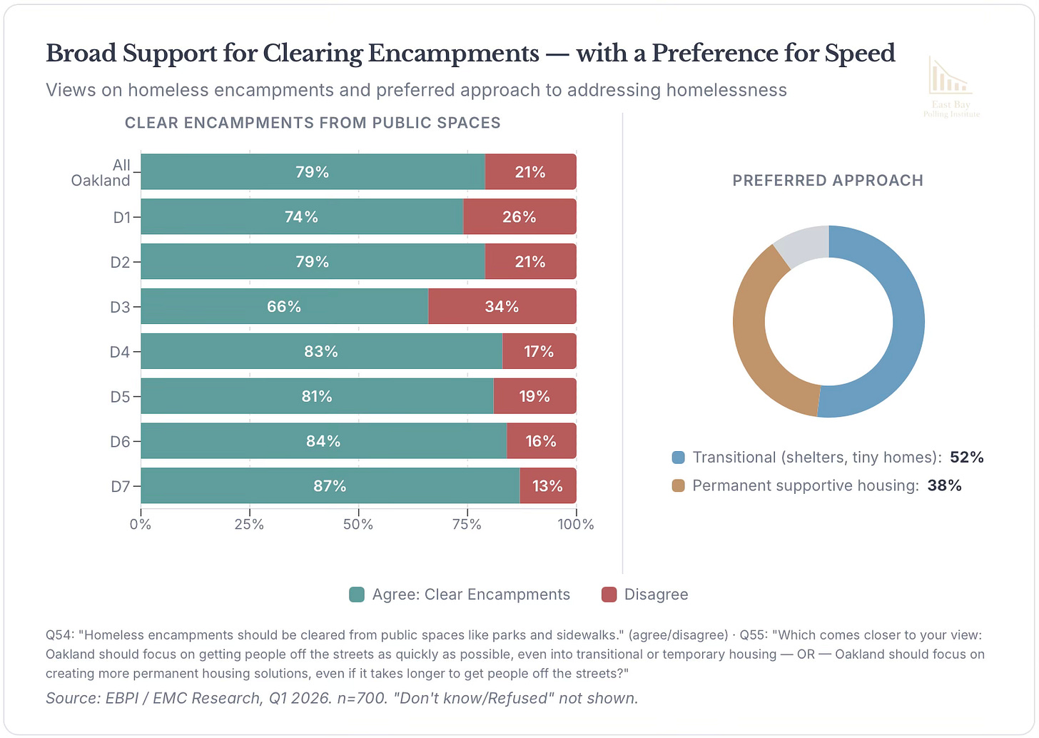 That said, 64% support Oakland’s city charter moving to a strong-mayor system, signaling they want to empower our mayor to succeed, but they also need to see results.