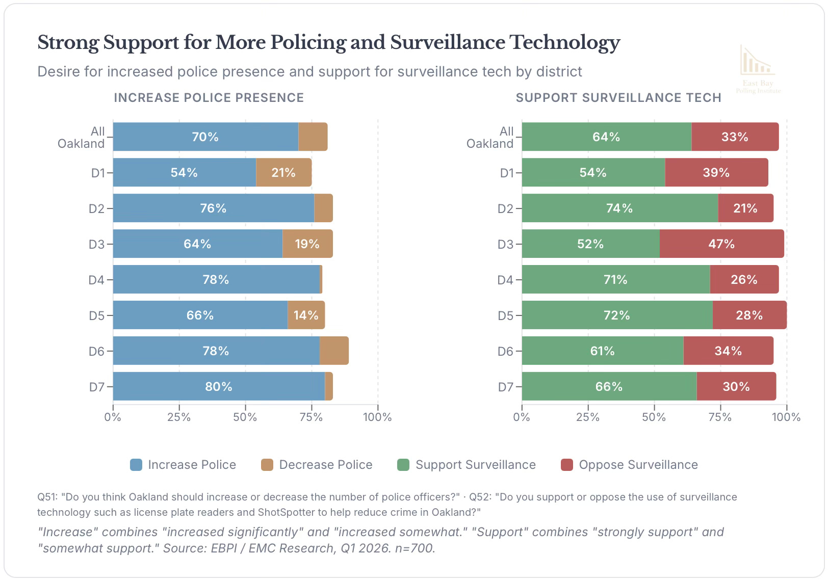 70% of voters support increased police presence city-wide, and that support was highest in Districts 2, 4, 6, and 7, exceeding 75% and capturing much of East Oakland.