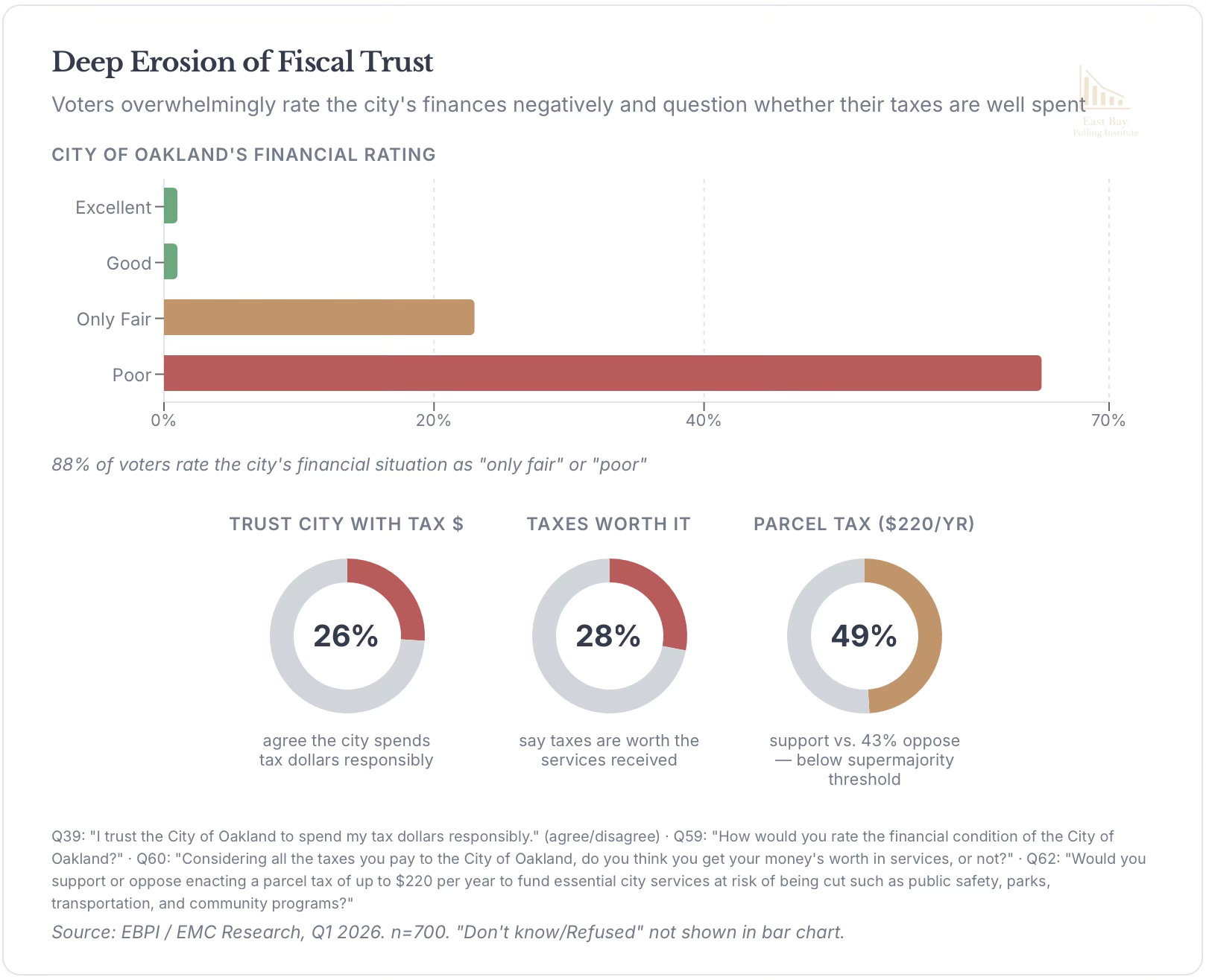Public safety ranked as the single most important problem facing Oakland, cited by 28% of respondents, nearly double the next highest issue (“housing and cost of living” at 16%).